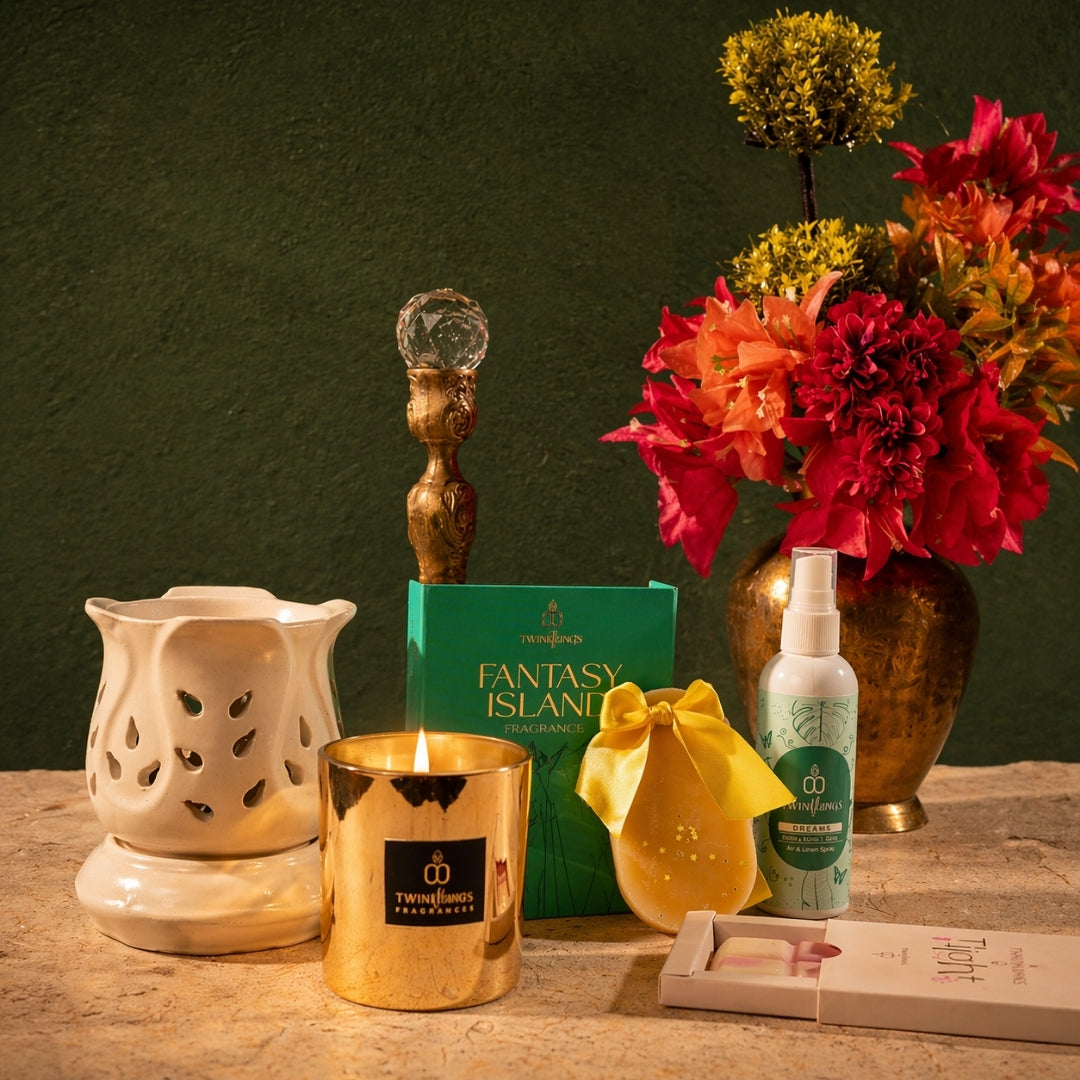 Mehfil Glow Box – Tea Light Diffuser, Oils, Reed Diffuser & Shot Glass Candle