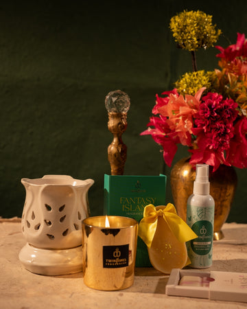 Celebrate every occasion with the Twin Flames Jashn Aroma Gift Box, a luxurious ensemble designed to delight the senses. This thoughtfully curated set includes a stylish diffuser, fragrant wax melt, natural freshener, handmade fragrance bar, and a hand-poured candle—everything you need to transform your space into a haven of aroma and elegance.