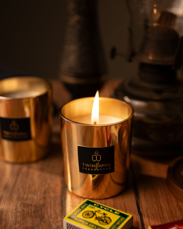 A hand-poured candle crafted with care, offering a warm glow and enchanting scent that creates an atmosphere of comfort, romance, and timeless elegance.