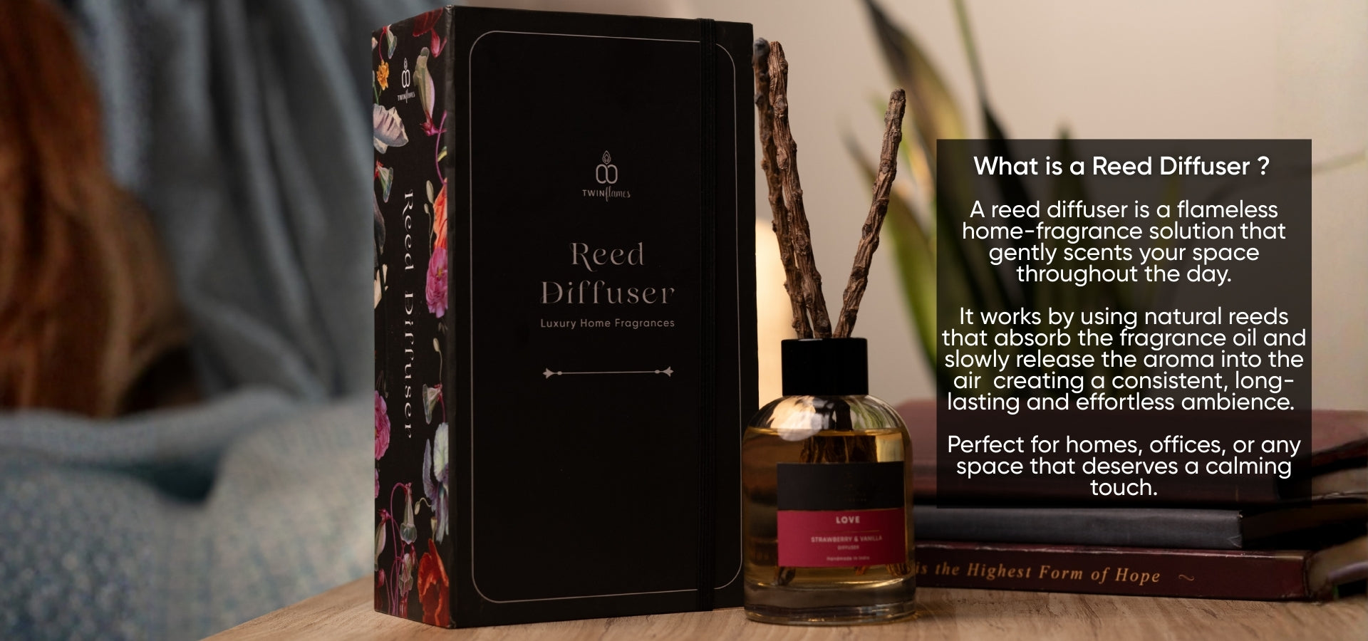 Depending on room size, airflow, and usage, a Twin Flames reed diffuser typically lasts 4–6 months.