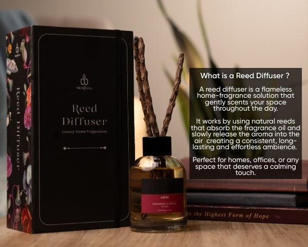 Reed diffusers work by absorbing fragrance oil through natural reeds, which then release the scent slowly and continuously into the air - no flame or electricity required.