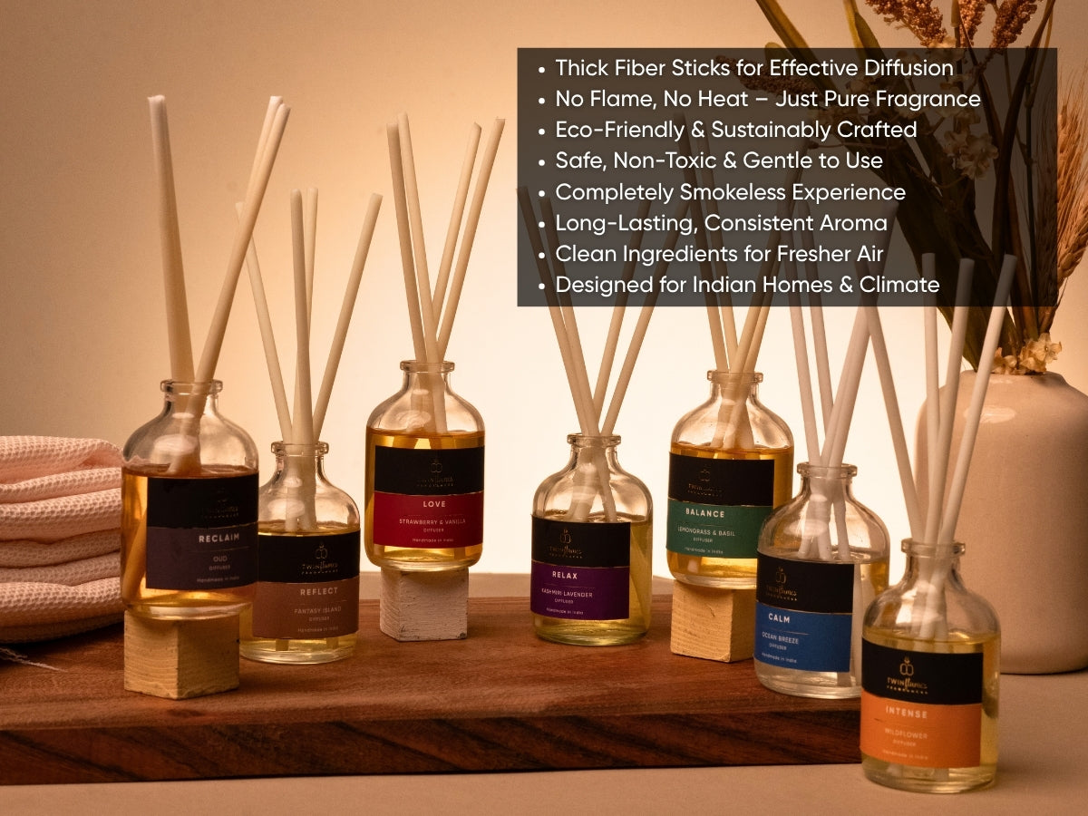 Our candles are crafted with toxin-free wax and 100% lead-free cotton wicks for a safe, soot-free glow, while the reed diffuser uses premium fragrance oils with fiber reed sticks to ensure steady, flame-free aroma diffusion.